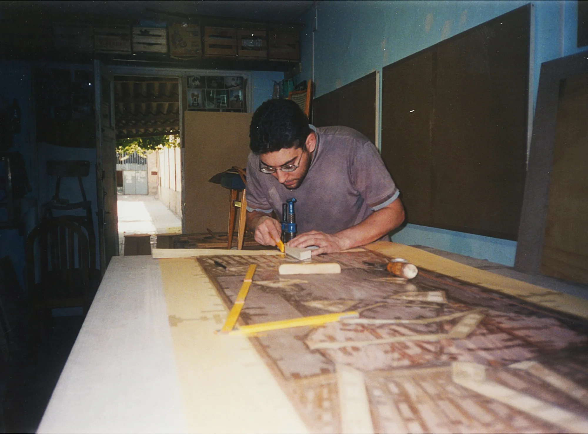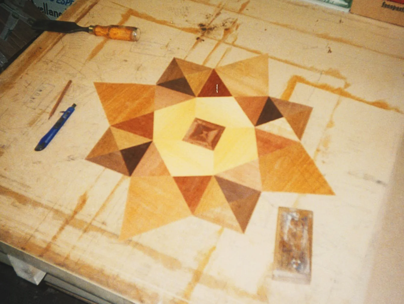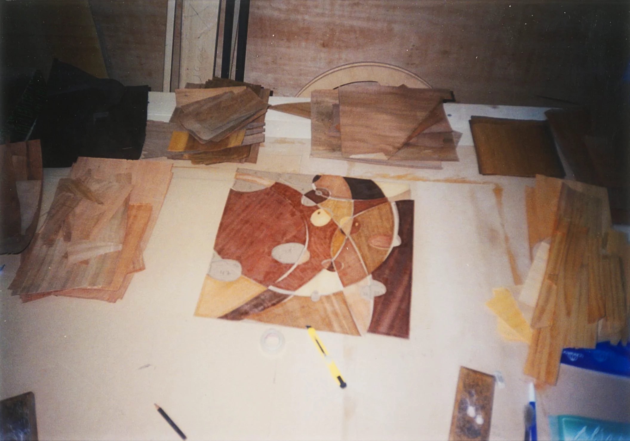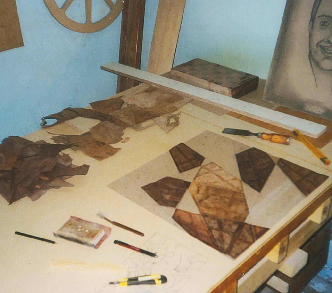 Su encanto por la técnica y el arte de la Marquetería lo descubre a los 10 años en el mismo taller, cuando le llega por encargue a su padre la terminación de un pequeño cuadro inconcluso, que rechazó, siendo Roberto quién desafía el compromiso y lo realiza con absoluta prolijidad. Con los años le piden restaurar una mesa hecha en un país Africano, con ésta técnica de Marquetería. Las señales son claras y es así como Roberto Chiarello decide de lleno dedicarse a investigar y buscar referentes sobre ésta magnífica técnica unida a la creatividad singular de su talento como artista multifacético. La tenacidad del autor lo enfrenta a un desafío aún mayor frente a la creación de la obra y la sensibilidad de los sentidos como la vista, ya que en 1997 sufre un desprendimiento de retina de uno de sus ojos, mientras que en el otro posee miopía. Lograda la técnica se destaca el artista, procedimiento y talento van de la mano, en el ensamble de formas y texturas hapticas y ópticas, juega con la combinación de los cuerpos que se expresan sublimes en la lisura y el contraste de tonalidades marrones y ocres entre los oscuros y claros, de la variación cromática que permiten las variedades y calidades de la madera. Las composiciones de los cuadros se manifiestan entre formas geométrica importantes desde lo no figurativo hacia la abstracción, tras la búsqueda de formas, aludiendo a objetos, animales o personas, avanzando y denotando en su hacer inmediato un marcado acento surrealista en la búsqueda y definición de figuras expresivas. La minuciosidad del trabajo creativo, el cuidado hasta en cada beta de la madera, y la intensiva importancia del luste, nos muestra una obra impecable de acuerdo a las exigencias del artista. Es la ” voluntad creadora “, los conocimientos y experiencia minuciosa de años de trabajo, lo que fluye día a día en el hacer artístico de Roberto Chiarello, su “dialéctica íntima con la madera y su expresión bidimensional en el arte de la Marquetería”, con una producción de excelencia.